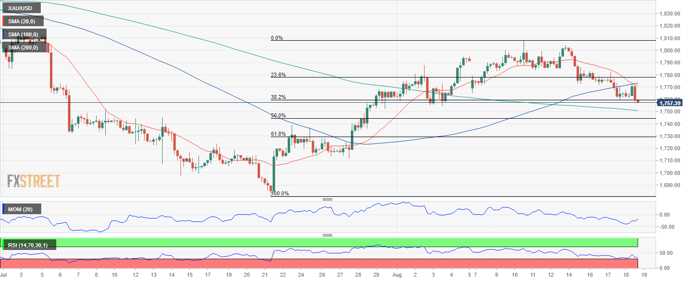 Technically, the XAUUSD pair is at risk of falling further, piercing a critical Fibonacci support level at $1,759.10, the 38.2% retracement of the latest daily rally between $1,680.82 and $1,807.86. In the daily chart, gold failed to recover above its 20 SMA and quickly accelerated its slide, while the 100 SMA crosses below the 200 SMA, both far above the shorter one. Technical indicators, in the meantime, maintain their downward slopes after moving into negative territory.