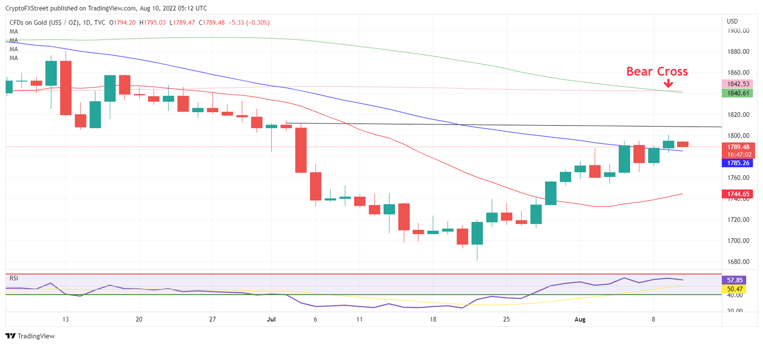 Gold price tested the $1,800 mark for the first time in over a month on Tuesday, having shrugged off resurgent demand for the US dollar even as the Treasury yields jumped across the curve. Growing concerns over global economic slowdown and China-Taiwan geopolitical tensions helped XAU buyers to extend the previous upside. Further, expectations that easing inflationary pressures in the US economy would dissuade the Fed from delivering super-sized rate hikes lifted the sentiment around the non-interest-bearing gold. The annualized US Consumer Price Index (CPI) is seen softening to 8.7% in July from 9.1% in June. The core figures, however, may have quickened over the year.
