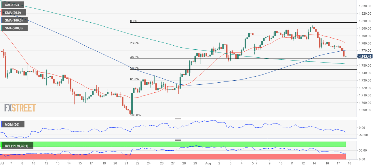 The XAUUSD pair is at the brink of turning bearish in the mid-term. The daily chart shows that the pair is battling the 38.2% retracement of its latest daily run measured between $1,680.82 and $1,807.86 at $1,759.10. Technical indicators head firmly lower, the Momentum around its 100 level but the RSI is already at 46. At the same time, the pair is currently crossing below a bullish 20 SMA for the first time in over a month.
