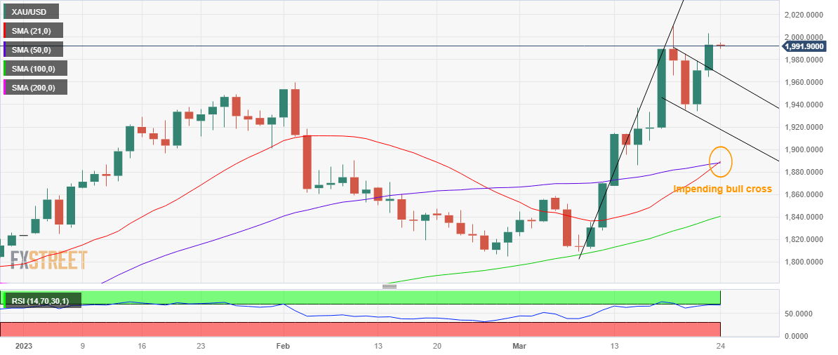 Gold price has entered a phase of upside consolidation just shy of the $2,000 mark, as traders look forward to the preliminary S&P Global business PMIs from the Euro area economies and the United States, in the face of the recent banking sector crisis. Markets continue to stay jittery on concerns looming over the global banking sector, motivating the US Dollar bulls to recover some ground but persistent weakness in the US Treasury bond yields amid the dovish US Federal Reserve (Fed) policy outlook.