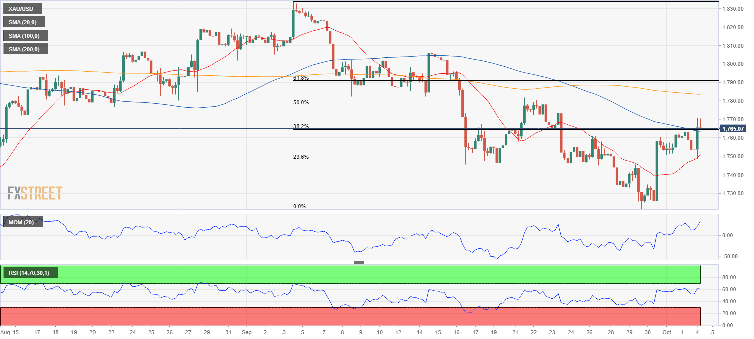 XAU/USD trades just above the 38.2% retracement of its latest daily slump, and the daily chart indicates that further gains are still in doubt. The bright metal stalled just below a bearish 20 SMA, while technical indicators have turned flat within negative levels. A daily close above 1,765.35, a Fibonacci level, should favor a bullish extension in the upcoming sessions.