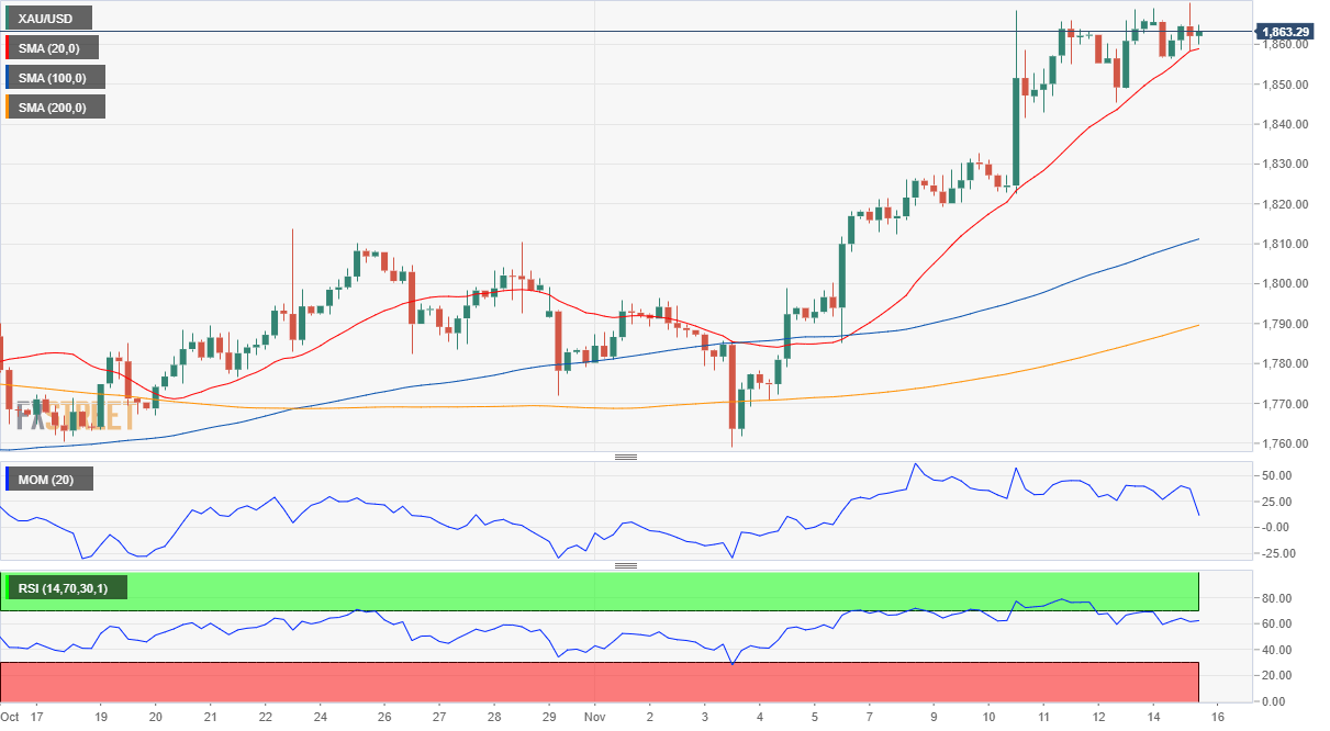 Gold consolidates gains in the $1,860 price zone, marginally lower on a daily basis, although after reaching a fresh multi-month high earlier in the day. XAU/USD hit 1,870.48 during London trading hours, as the greenback shed ground on the heels of a better market mood. Chinese data released at the beginning of the day was upbeat, helping to ease growth-related concerns.