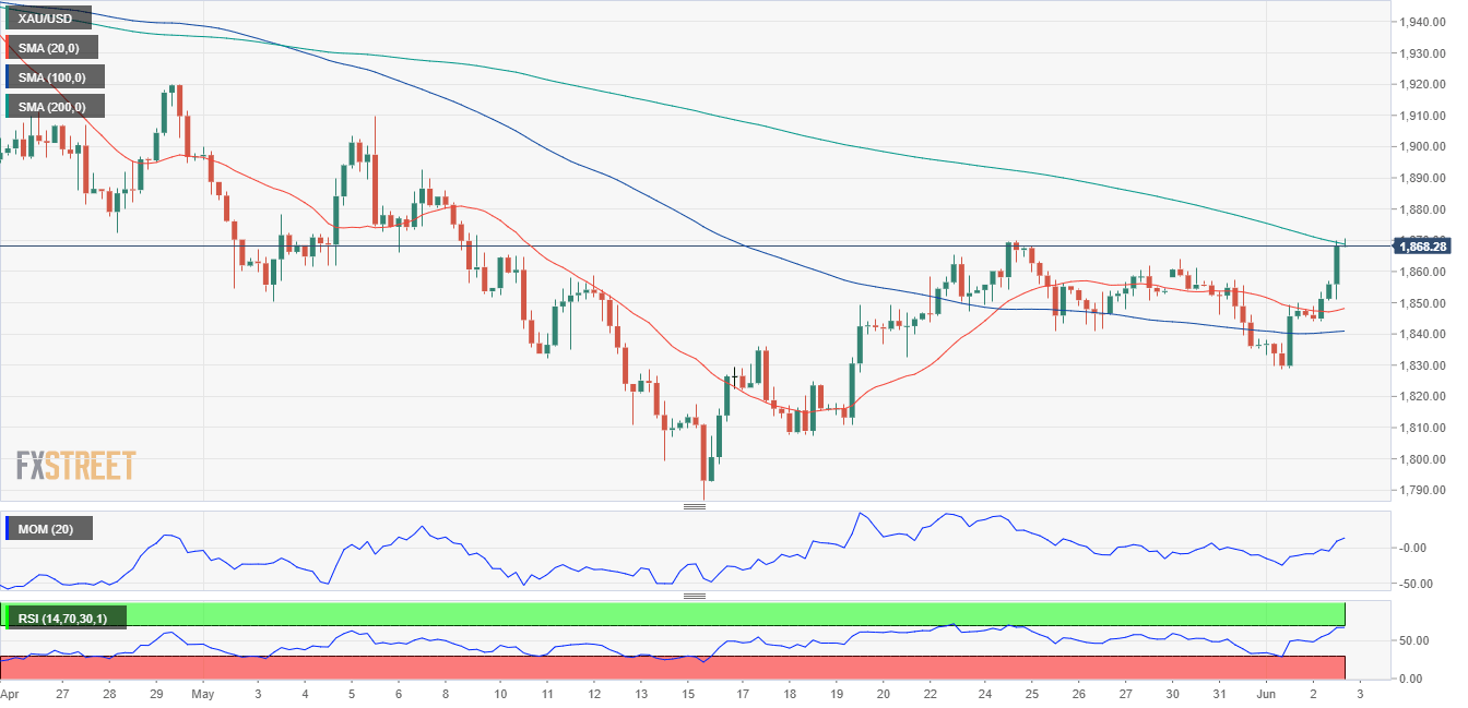 Technical readings in the 4-hour chart also favor a bullish extension, particularly if the pair extends its gains beyond a bearish 200 SMA, now providing dynamic resistance at around $1,871.50. Meanwhile, the Momentum indicator heads firmly higher, well above its midline, while the RSI indicator approaches overbought conditions, all of which reflect persistent buying interest.