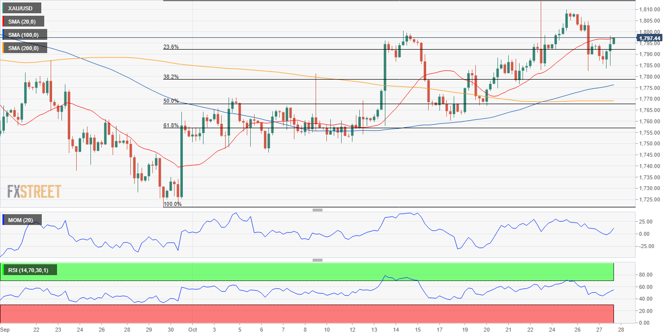 The 4-hour chart offers a neutral stance for the near term, as gold is meeting intraday sellers around a flat 20 SMA while holding above the longer ones. However, technical indicators remain directionless around their midlines, reflecting the absence of directional strength. A candle close above 1,800.60 should favor another leg north towards the monthly high at 1,813.80.