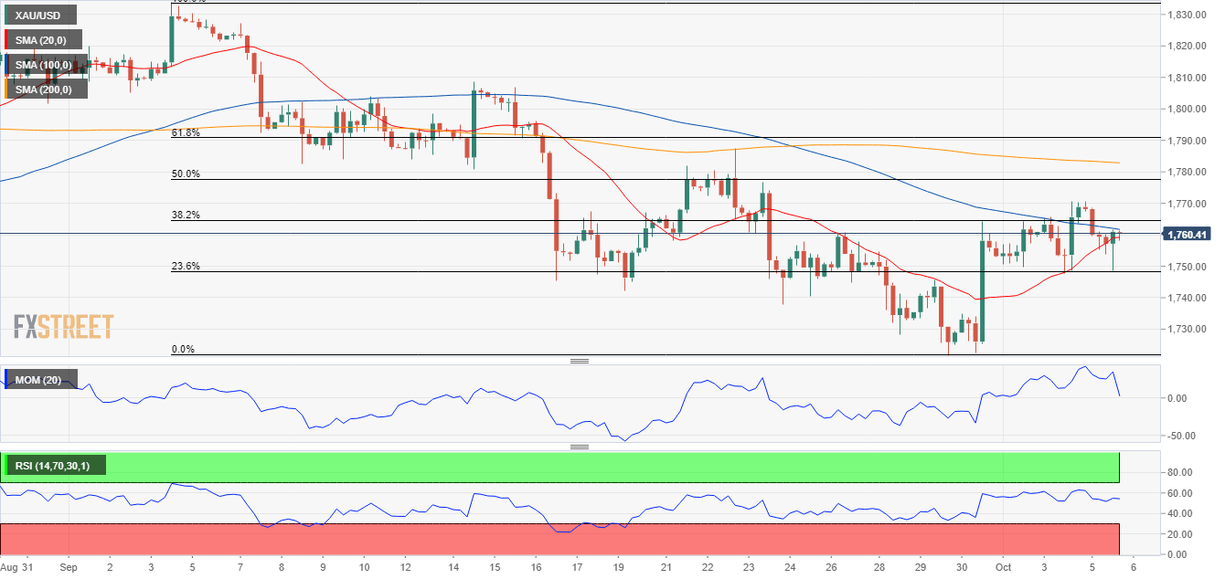 For the near term, the outlook is neutral-to-bullish as XAU/USD is standing above a bullish 20 SMA, while technical indicators aim higher from around their midlines. The 100 SMA maintains a modest bearish slope near the next Fibonacci resistance level at 1,764.35, the level to beat to expect additional gains in the upcoming sessions.