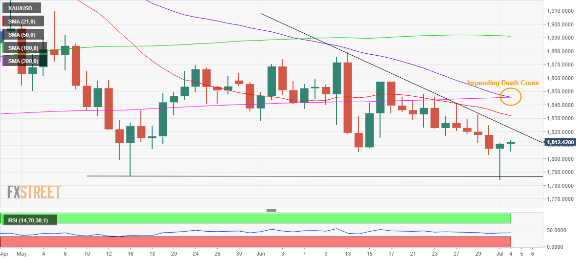Gold Price extended its previous sell-off and hit over five-month lows at $1,785, following a firm break below the critical $1,800 level. Although bulls fought back control and drove the rates back above the latter, in an impressive turnaround to book the third straight weekly loss. The US dollar continued to move towards the two-decade highs of 105.79 against its major peers, as the buck remained in a win-win situation, in the face of an aggressive Fed tightening stance and growing economic slowdown concerns. Despite softening US PCE Core inflation, a slump in the ISM Manufacturing PMI to 53.0 in June, revived recession fears. However, US Treasury yields kept falling and Wall Street indices recovered a part of their weekly losses, prompting gold bulls to stage a solid comeback. The end-of-week flows also helped the bright metal survive the early turmoil, as investors closed out their positions heading into a long weekend break. The US stocks and bond markets will remain closed on Monday on account of Independence Day.