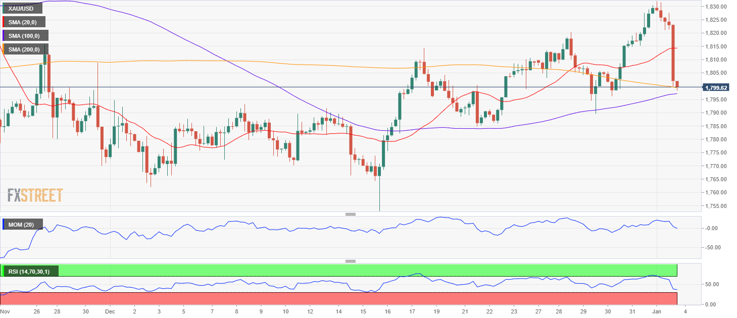 - XAU/USD trades at around 1,800 with a firmly bearish stance in the near term.
