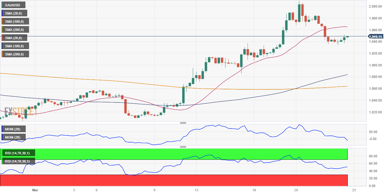 Spot gold trades lifeless around $1,940 a troy ounce on Wednesday as investors await the United States Federal Reserve (Fed) monetary policy announcement. The US Dollar heads into the event with a weak tone amid a better market mood, as investors believe the worst of the banking crisis is over. Still, caution reigns amid uncertainty about what the central bank will do from now on.