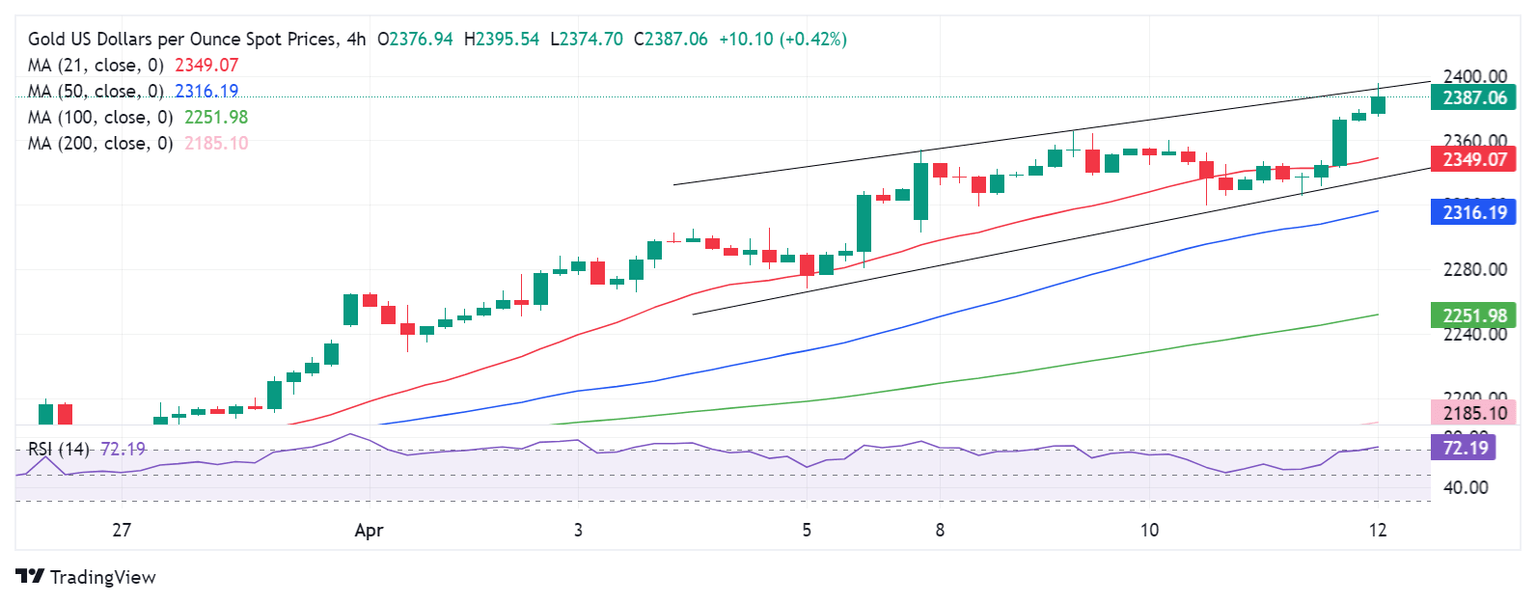 As observed on the four-hour chart, Gold price is battling the upper boundary of the rising wedge formation at $2,392, having hit a fresh record high just above it at $2,396.