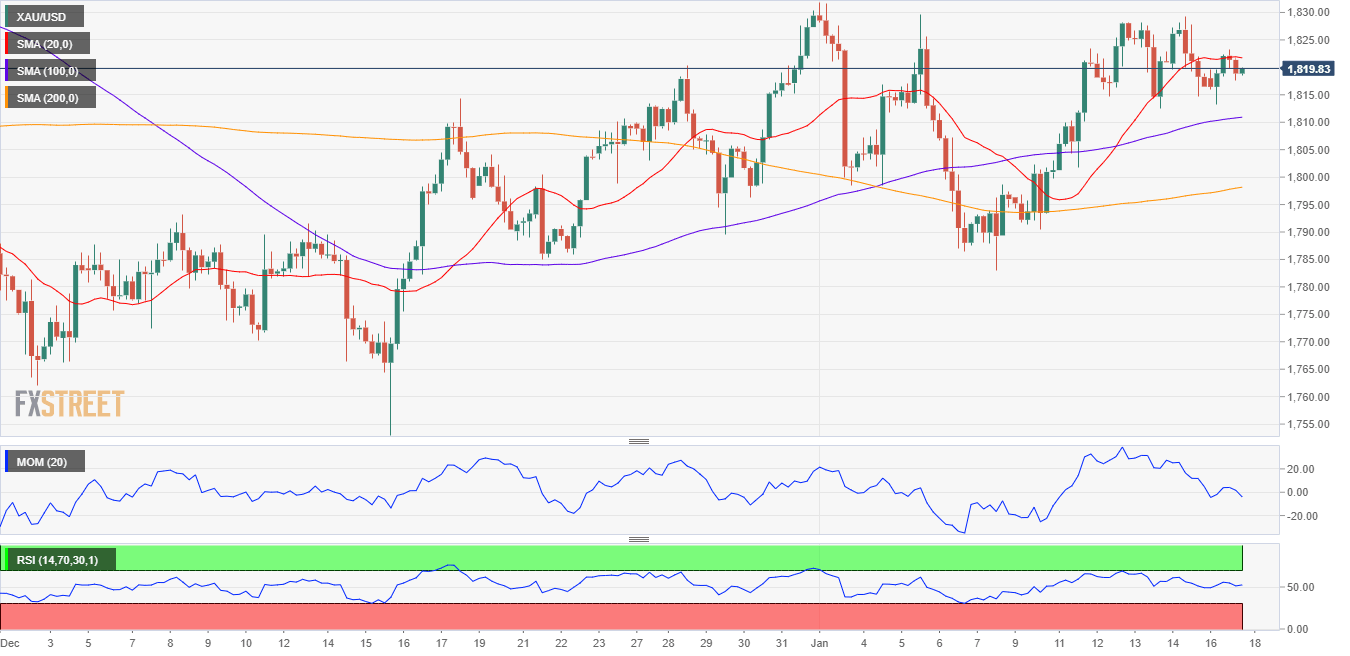 The near term picture for the XAU/USD pair is plain neutral, as a flat 20 SMA provides intraday resistance, while technical indicators hover directionless around their midlines. Bulls may have better chances if the metal breaks above 1,829.60, a relevant resistance level.