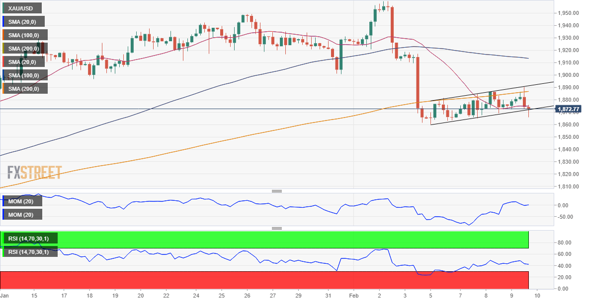 The 4-hour chart that the pair was developing in a near-term ascendant channel coming from this week's low posted on Monday at $1,860.20, also a one-month low. The top of the figure is currently at $1,893.50, the level to break for a more sustainable bullish run. However, XAU/USD is currently piercing the base of the figure. A close below it should invalidate the figure while hinting at additional slides.