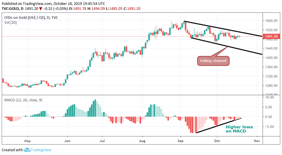 Gold is trapped in a falling channel since early September, as seen in the daily chart.
