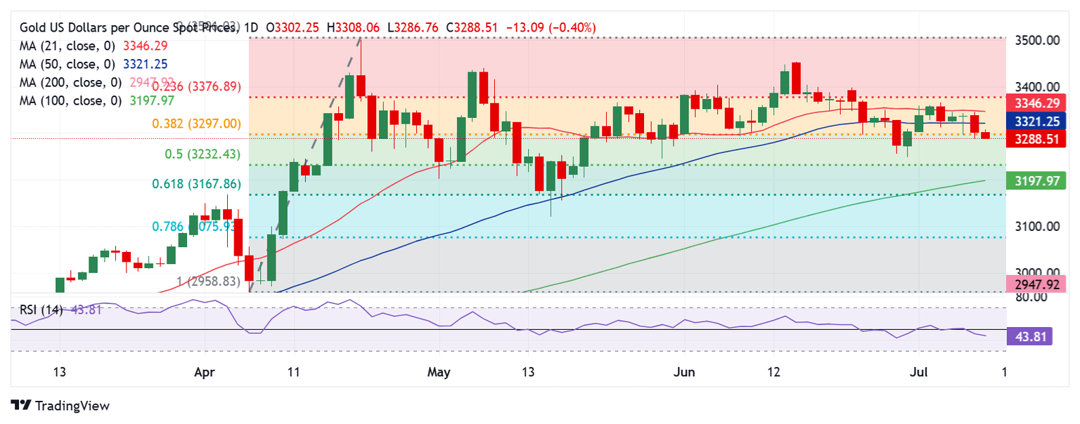 Gold price broke the recent range to the downside after piercing through the 50-day Simple Moving Average (SMA) at $3,322 on a daily closing basis on Tuesday.