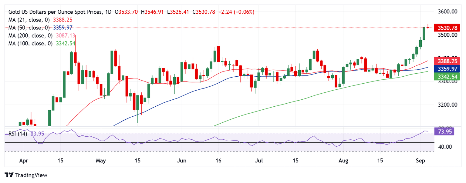 - Gold refreshes record highs near $3,550, then retreats early Wednesday.