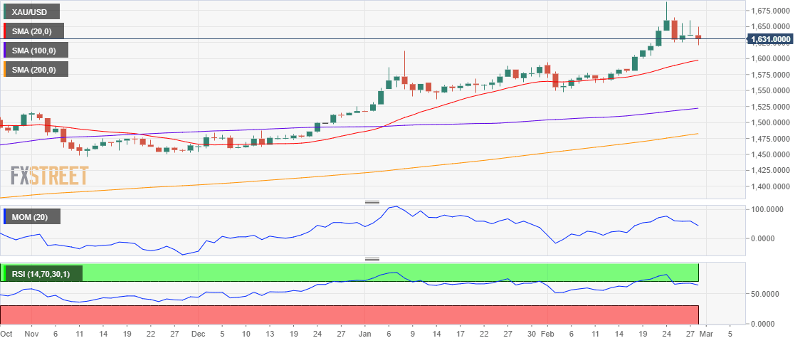 Spot gold has been stable around 1,630/50 in the last three trading days, down roughly $60.00 from its weekly high, but holding on to its long-term bullish trend. The weekly chart shows that technical indicators have reached overbought levels, where they are currently consolidating. Also, the commodity is developing far above bullish moving averages, with the closest being the 20 SMA, which stands at around 1,526.