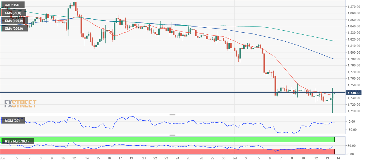 Gold Price has bounced sharply from a fresh 2022 low of $1,706.88 a troy ounce and currently trades at around $1,738.00. The dollar soared following the release of the US Consumer Price Index, which jumped by 9.1% YoY in June, surpassing the 8.8% rise expected. The higher-than-anticipated figure spurred risk aversion as investors rushed to price in a more aggressive monetary tightening by the Fed.