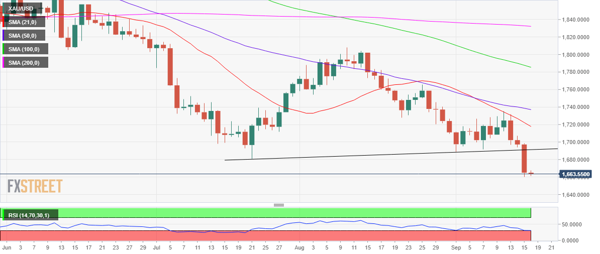 Gold price is consolidating Thursday’s massive sell-off on the final trading day of the week, keeping close proximity to the weakest level since April 2020 hit at $1,660. The bright metal is down 3% so far this week, on track for the sixth straight monthly decline. The narrative of hefty Fed rate hike expectations in the coming months could continue playing out this Friday, although gold traders could take profit on their short positions under the pretext of excessive selling and position re-adjustments ahead of next week’s FOMC decision. The end-of-the-week flows could also have a significant impact on the dollar valuations, eventually impacting the USD-priced gold. At the moment, markets are fully pricing 75 bps Fed rate hike next week, a possibility of even as high as 100 bps lift-off remains on the table.