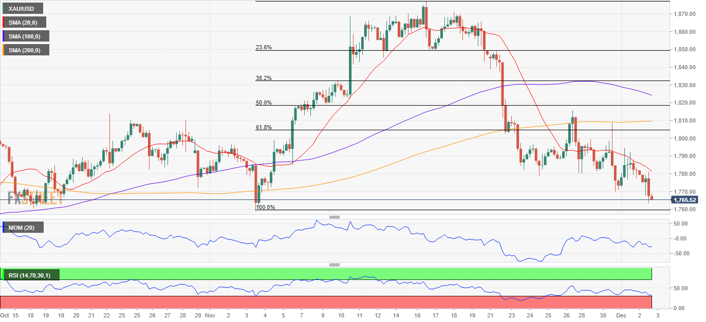 XAU/USD keeps approaching its November low at 1,758.81, the immediate support level and a probable bearish target. The bearish potential is clear in the daily chart, as the bright metal posted a lower low while it continues to develop below all of its moving averages. At the same time, technical indicators have strong downward momentum, standing well into negative levels.