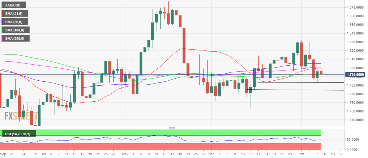 Gold price staged a solid comeback on Friday, bouncing off a fresh three-week low of $1,783 reached in a knee-jerk reaction to the US labor market report. Despite a disappointment in the headlines Nonfarm Payrolls figure, gold price took the hit from an upside surprise in the wage inflation, which suggested that Fed is behind the curve and should accelerate its tightening plans. The US economy added 199K jobs in December vs. 400K expected while the monthly gain in Average Hourly Earnings came in at 0.6%, above expectations for it to rise to 0.4% from November's 0.4% MoM level. Concerns over-aggressive Fed rate hike expectations spooked investors, triggering a sell-off in Wall Street indices, as the Treasury yields spiked to the pre-pandemic levels. The benchmark 10-year yields rose briefly above 1.80%, the highest level since January 2020. Gold bulls were unfazed by surging yields, as the tech sell-off on Wall Street prompted outflows out of the US dollar, aiding the metal’s rebound. The renewed upside, however, remained capped below the $1,800 threshold.