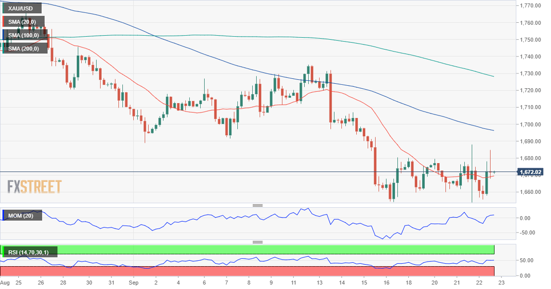 Spot gold trades around its daily opening, just above $1,670 a troy ounce. The bright metal consolidated within Wednesday’s $30 range as multiple central banks’ monetary policy decisions maintained traders busy since the day started. For the most, global policymakers are worried about bringing inflation down but seem more concerned about economic growth, regardless of refraining from commenting on potential recessions.