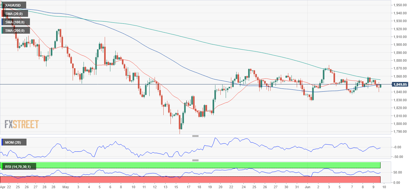 XAUUSD is little changed for a second consecutive day, holding above the $1,840 price zone. The daily chart shows that the bright metal is holding above the 20 and 200 SMAs, both around $1,842.00 and providing dynamic support. Technical indicators have eased within positive levels and head modestly lower within neutral levels, anyway skewing the risk to the downside.