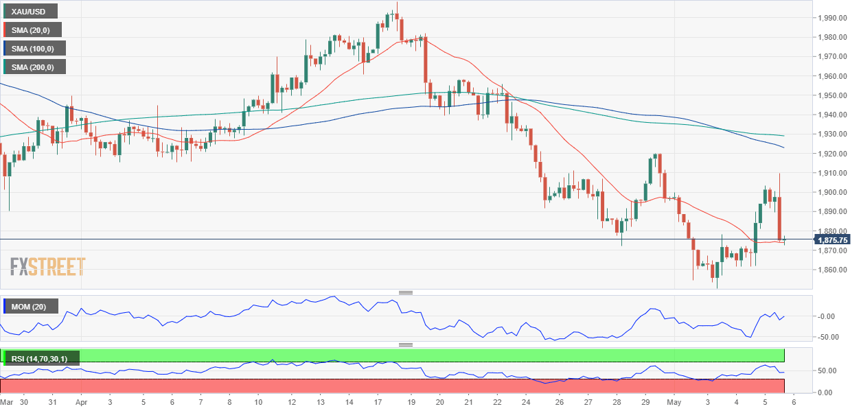 Spot gold is trading in negative territory after peaking at $1,909.72 a troy ounce in the Federal Reserve monetary policy decision aftermath. Wall Street reacted positively to the announcement, as US policymakers refrained from announcing a more aggressive monetary policy. Nevertheless, the US central bank hiked rates by 50 bps, the largest hike in twenty years, and announced it would start quantitative tightening in June.