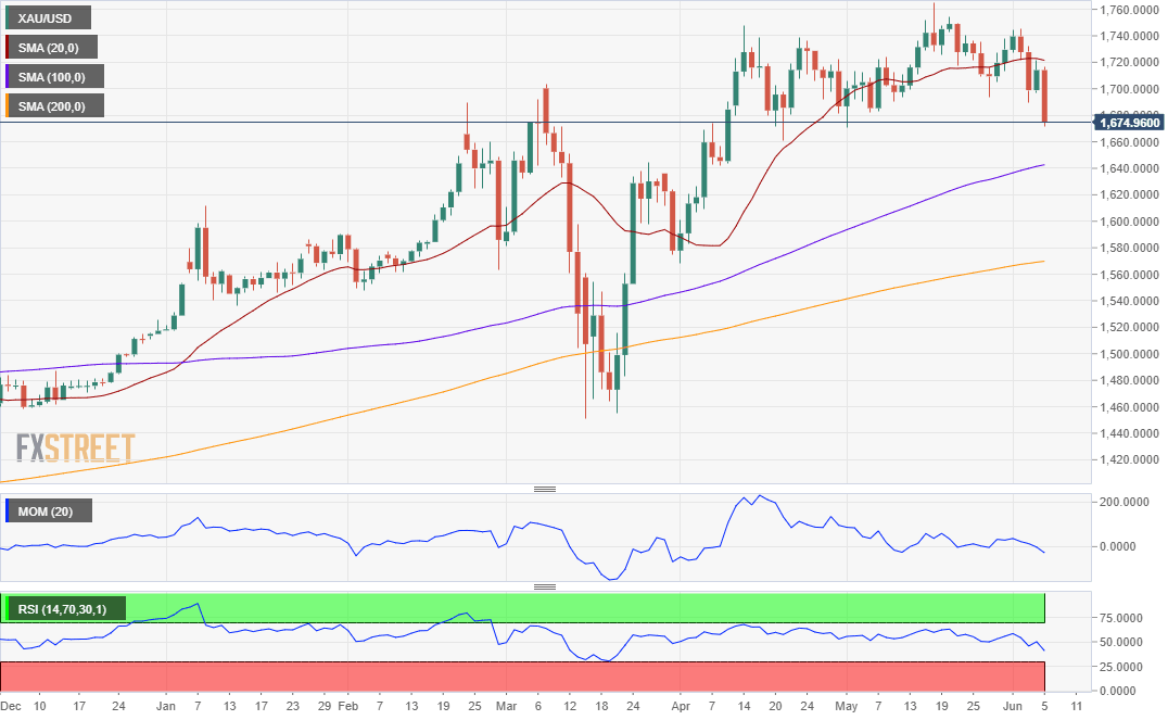 Spot gold trades at fresh five-week lows as the day comes to an end, and as said, approaching $1,670.00 a troy ounce. The sharp decline remains as corrective in the long term, as the weekly chart shows that the commodity continues to develop above a firmly bullish 20 SMA, while over $270 above the 100 SMA. Technical indicators retreated sharply from near overbought readings, although the Momentum indicator stabilised well above its midline while the RSI indicator keeps heading south, but at around 55. Not enough to confirm another leg south.