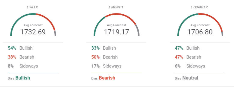 The FXStreet Forecast Poll indicates that speculative interest didn’t see the NFP coming, as most market players are betting for a bullish extension in the short-term towards 1,730. However, a corrective movement was anticipated as the outlook is bearish in the monthly perspective and neutral in the quarterly view. The average target, however, decreases as time goes by.