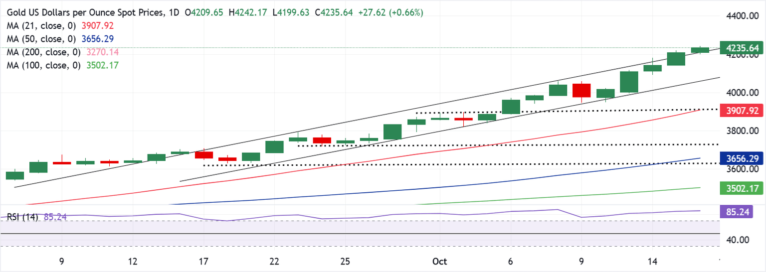 - Gold’s record rally remains uninterrupted so far this Thursday, as $4,250 appears within reach.