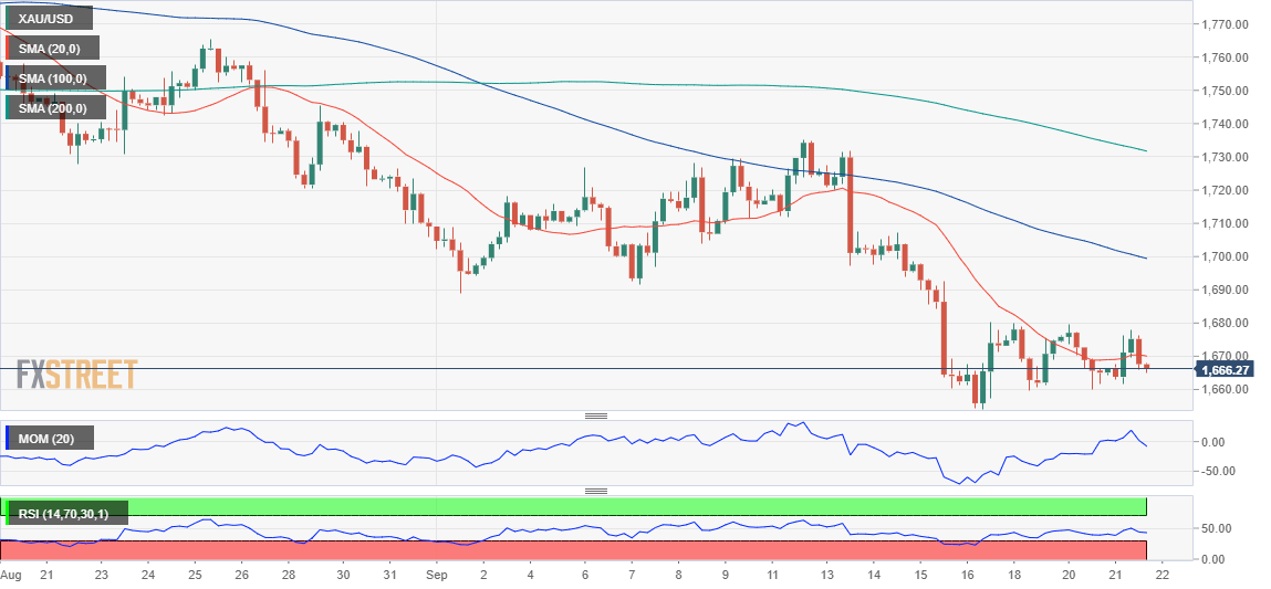 The American dollar firms up ahead of the US Federal Reserve announcement as XAUUSD trades around $1,665 a troy ounce, down from an intraday high of $1,677.80. The greenback gains by the hand of soaring government bond yields and despite the better tone of Wall Street.