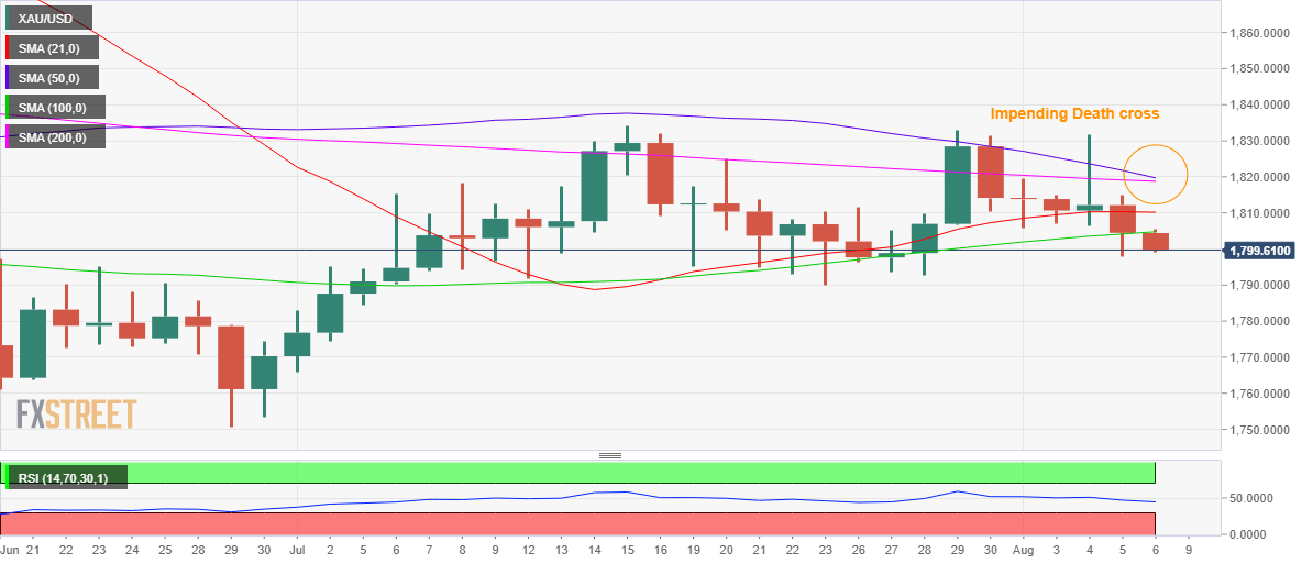 The risks remain to the downside for gold price amid a looming death cross on the daily time frame. The 50-DMA is fast approaching the 200-DMA, looking to pierce through the latter from above.