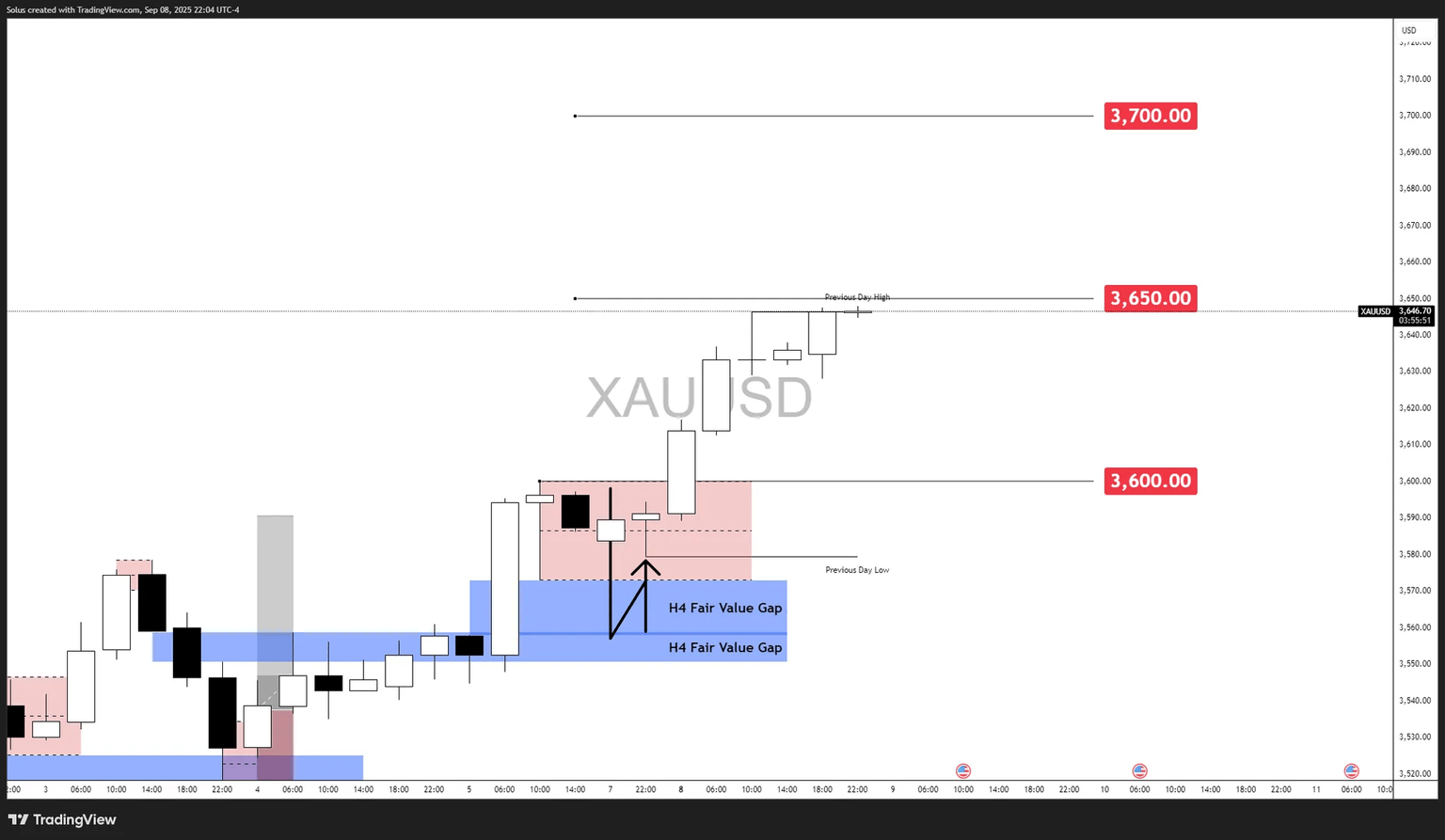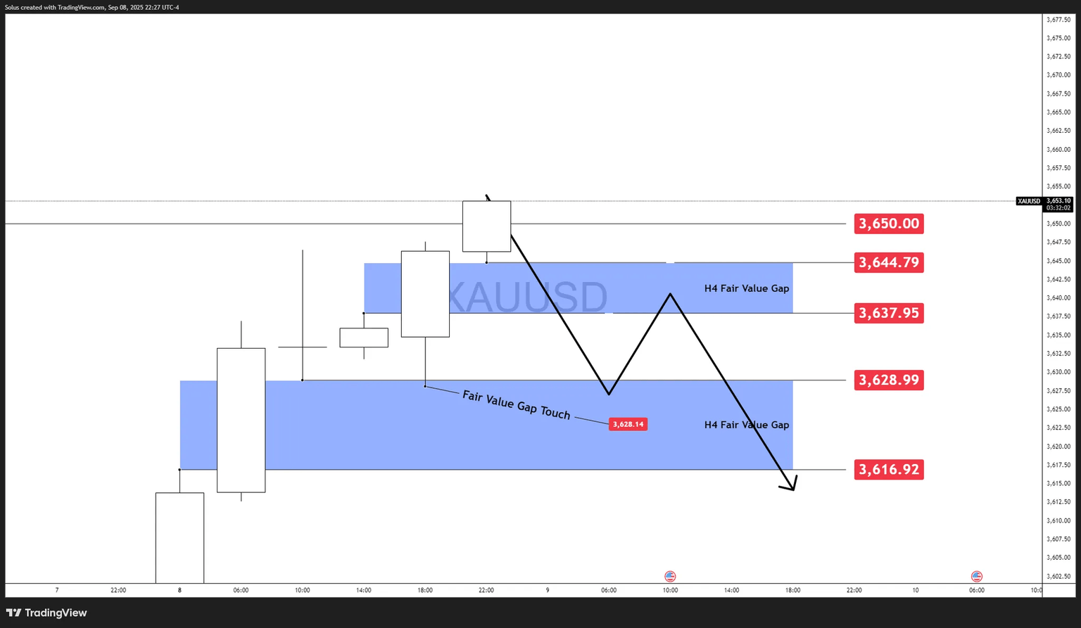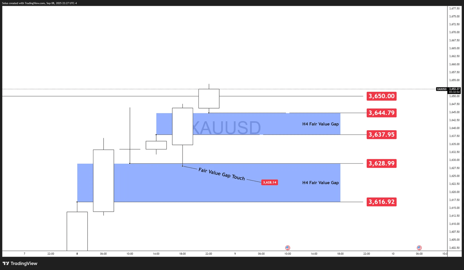 These FVGs between $3,616 - $3,645 are pivotal zones where buyers may attempt to step back in if price retraces. The reaction at these imbalances will dictate whether gold clears $3,650 for continuation or fades back into deeper retracement.