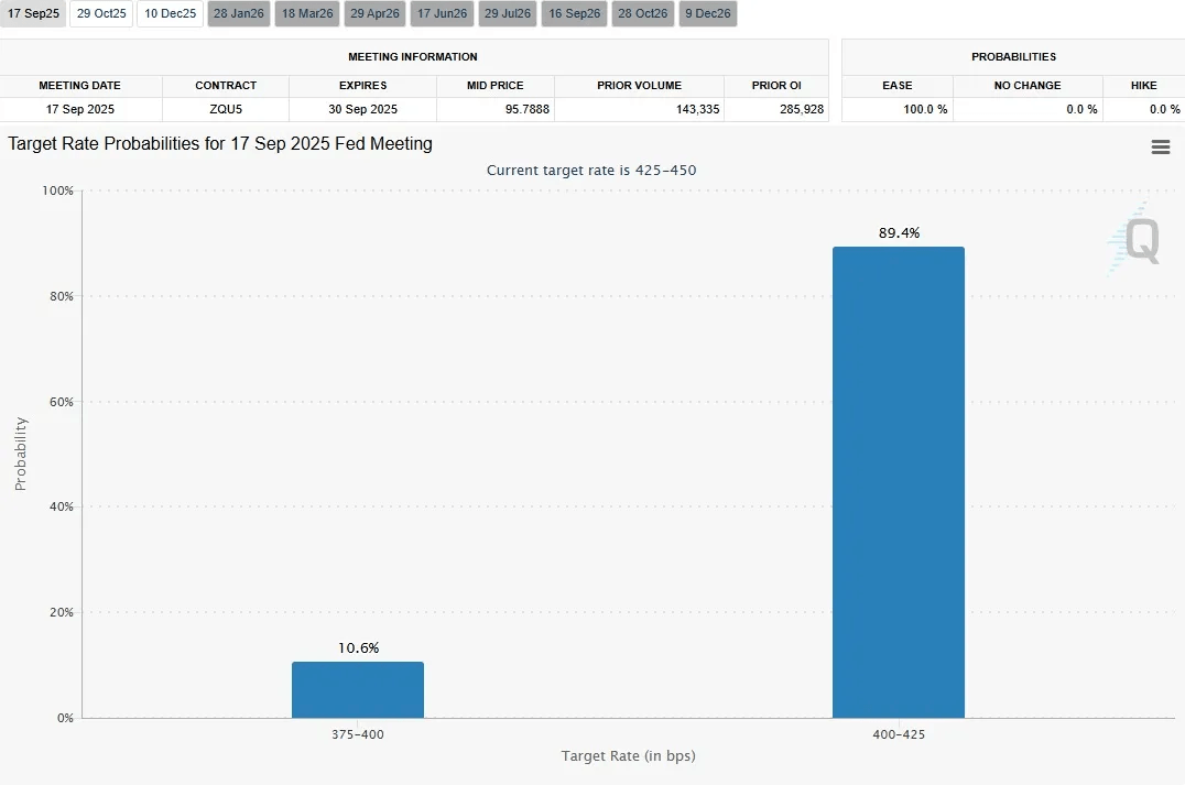 The CME FedWatch Tool now prices an 89% probability of a 25 bp Fed rate cut at the September 17 meeting, with a smaller 10% chance of a 50 bp move.