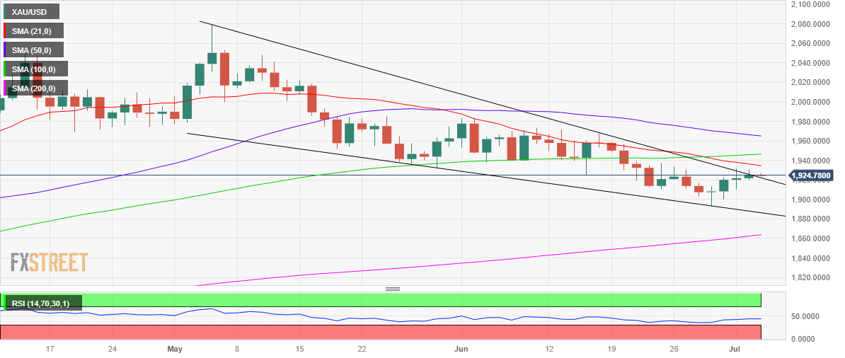 Gold price remains on track to confirm a bullish wedge, awaiting a daily close above the critical falling trendline (wedge) resistance, now at $1922. Gold price has been trading within a falling wedge after topping out at record highs of $2080 in early April.