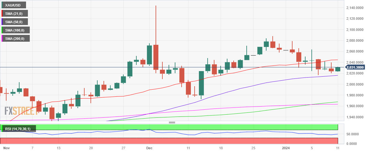 The intraday technical outlook for Gold price remains the same, as the bright metal is likely to remain confined between the 21-day Simple Moving Average (SMA) and 50-day SMA at $2,045 and $2,016 respectively in the run-up to the US CPI showdown.