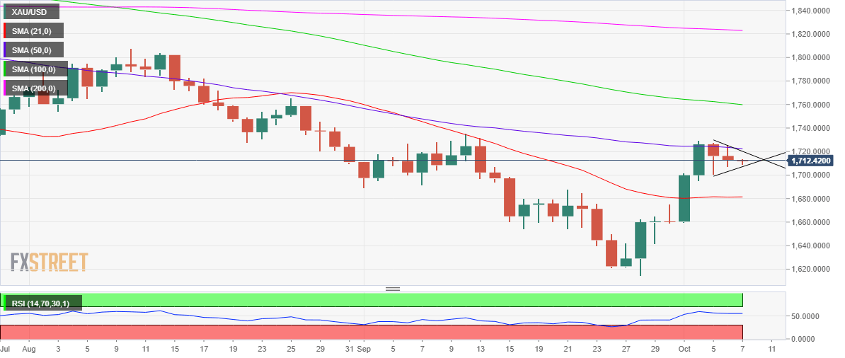 The next relevant upside targets are aligned at the $1,730 round figure and the September high of $1,735, above which doors open up for a fresh uptrend towards the $1,750 psychological level.