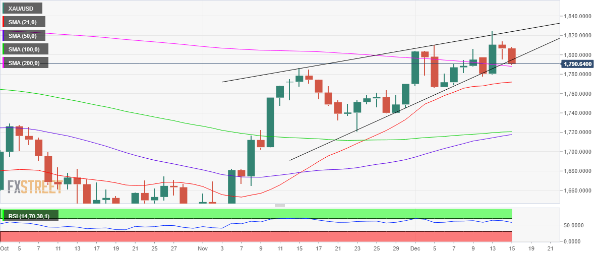 Having failed to resist above the $1,800 mark, Gold price is extending the previous decline this Thursday, as the United States Dollar (USD) pauses its sell-off alongside the US Treasury bond yields. Investors assess the December US Federal Reserve (Fed) policy decision and Chair Jerome Powell’s comments.