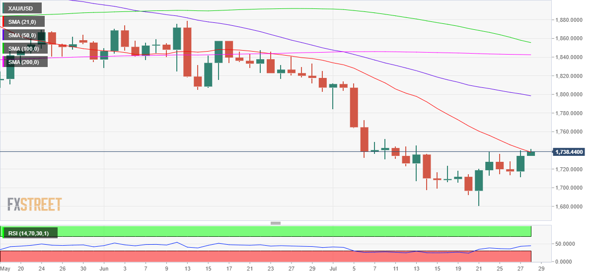 Gold price is flirting with the bearish 21-Daily Moving Average (DMA) at $1,738 after briefly recapturing the latter, earlier on.