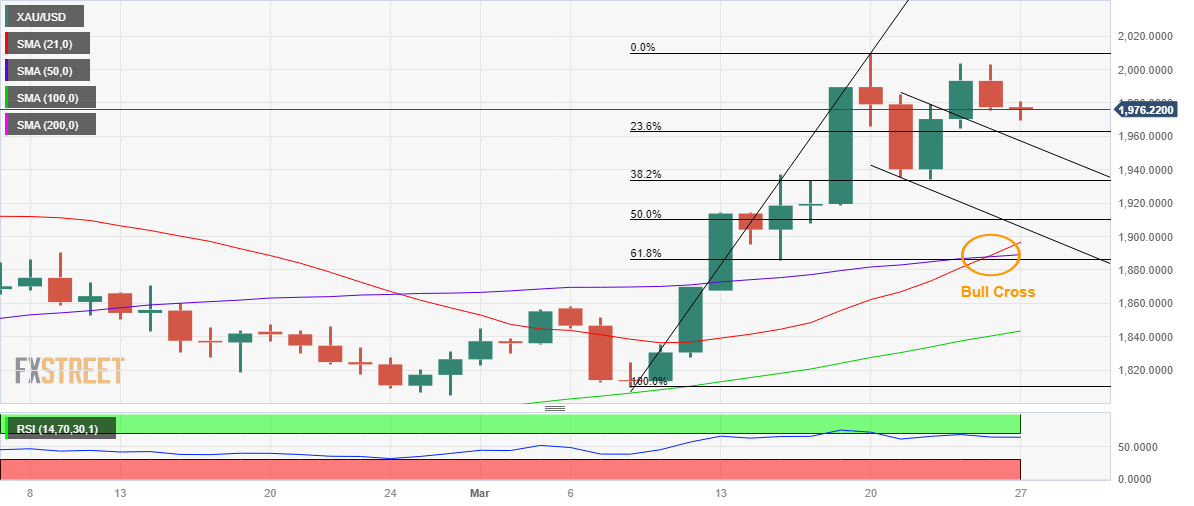 Gold price is keeping its corrective mode intact from yearly highs of $2,010, as the US Dollar clings to the recovery gains across the board amid cautiously optimistic markets. Strong US S&P Global Manufacturing and Services PMI data breathed life into the Federal Reserve hawks alongside the US Dollar. Meanwhile, the US Dollar also found another boost from the safe-haven flows, despite the late bounce in Wall Street indices. The United States flash Manufacturing PMI climbed to a still-subdued 49.3 in March from 47.3 in February. The Services PMI rose to 53.8 from 50.6, surpassing the market expectation of 50.5 by a wide margin. Investors shrugged off the disappointing US Durable Goods Orders data, as the US Dollar continued to find support from the banking crisis.