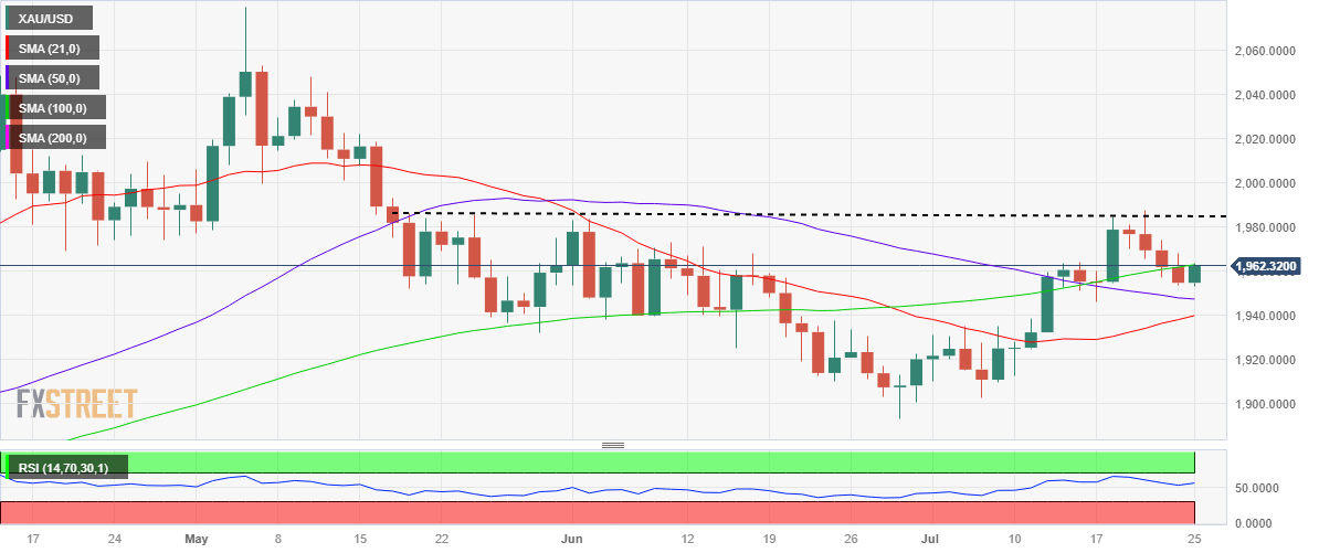 Gold buyers need acceptance above the 100-Daily Moving Average (DMA) support-turned-resistance at $1,963 on a daily closing basis to extend the rebound from six-day lows.