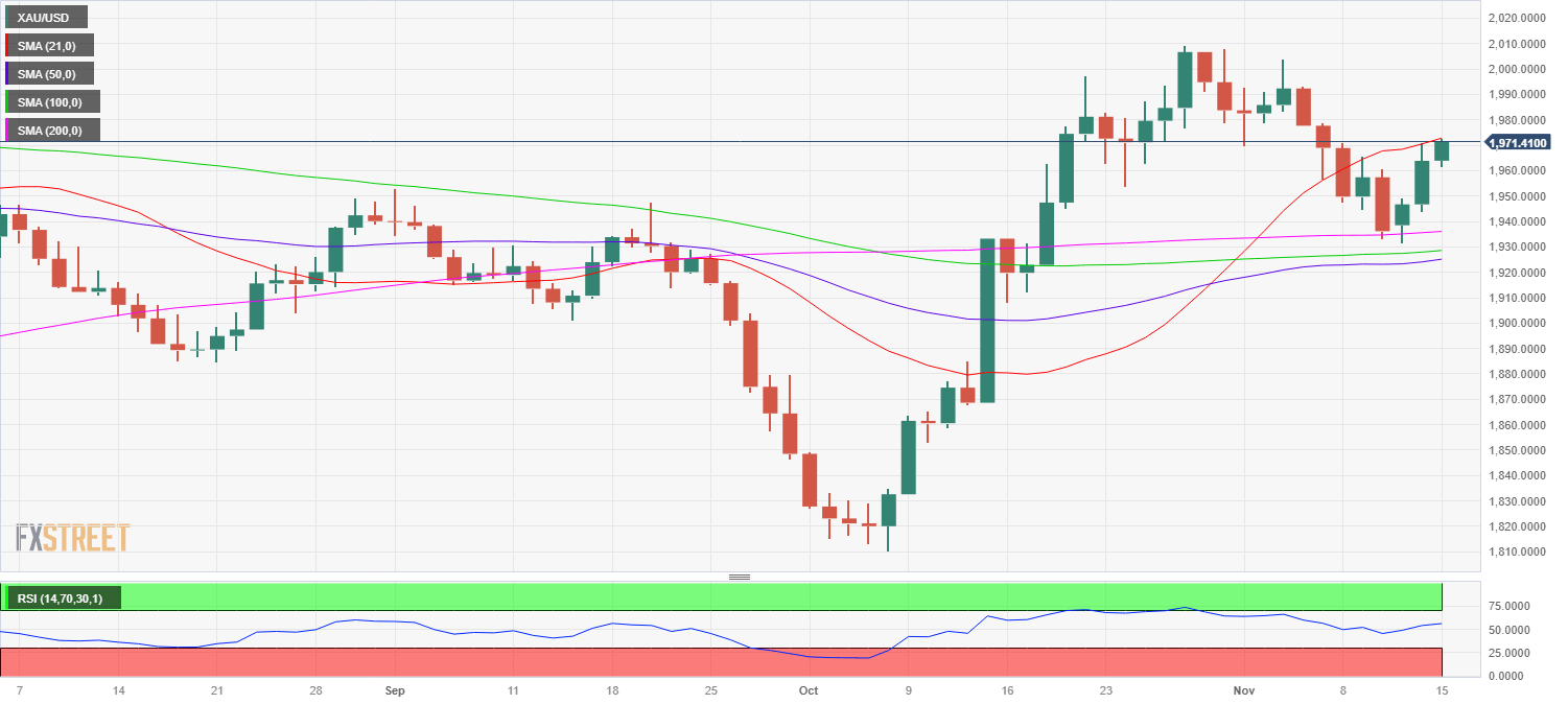Daily closing above the 21-day SMA at $1,973 is critical to unleashing further upside toward the $1,980 round number. The next relevant upside barrier is placed at the November 6 high of $1,993, above which the $2,000 mark will come into play.