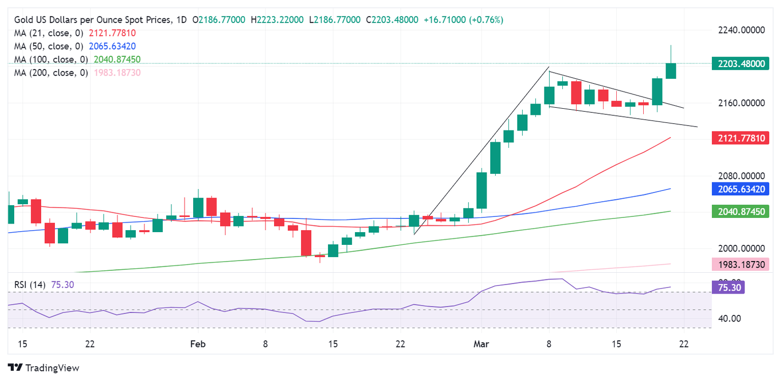 Gold price is correcting from a fresh all-time high of $2,223 reached in early Asian trading on Thursday, although defends the $2,200 threshold amid sustained weakness in the US Dollar (USD) and the US Treasury bond yields. Markets digest the dovish US Federal Reserve (Fed) no-interest rate change decision on Wednesday.