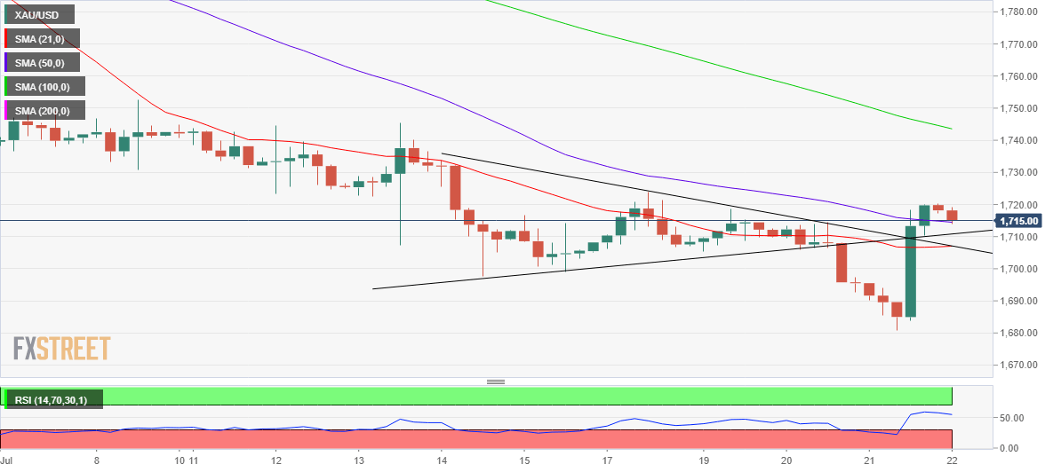 XAUUSD needs to defend the previous resistance now support of the 50-Simple Moving Average (SMA) at $1,714 for the upside to remain in place.