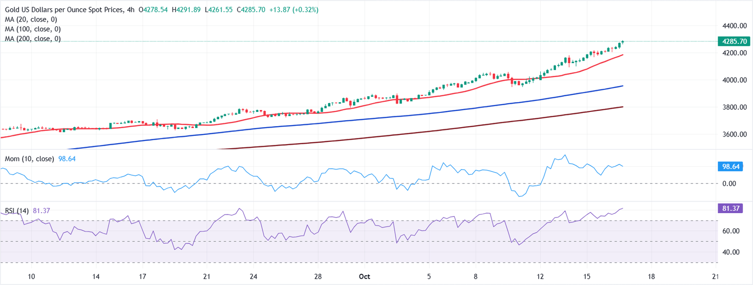 Speculative interest keeps hoarding Gold, with the bright metal nearing the $4,300 mark on Thursday. The XAU/USD pair reached $4,291.89 in the American afternoon, maintaining the upward pressure and aiming to test the next psychological threshold. Spot Gold ran throughout the day, accelerating north amid the poor performance on Wall Street.