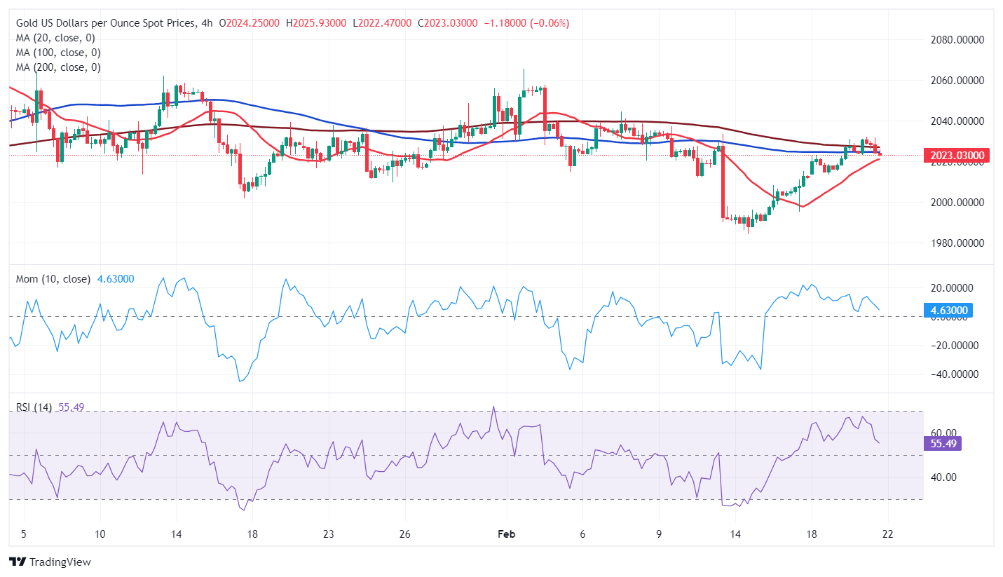 Exterminating the XAU/USD 4-hour chart, technical readings suggest easing optimism. Technical indicators remain within positive levels but offer bearish slopes, reflecting the ongoing selling. At the same time, the pair is breaking below converging and directionless 100 and 200 SMAs, while the 20 SMA keeps heading north below the current level, providing dynamic support at around $2,020.94.