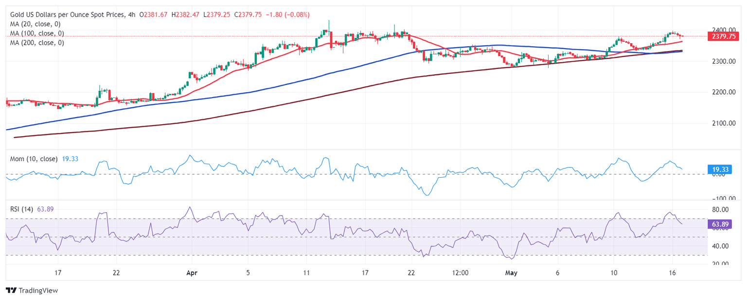 Gold trades with a soft tone on Thursday, hovering around the $2,380 level at the time being after peaking earlier in the day at $2,397.34. The US Dollar recovered some ground throughout the first half of the day after falling to fresh multi-week lows against major rivals following the release of discouraging United States (US) data on Wednesday. The country confirmed the Consumer Price Index (CPI) held at 3.4% YoY in April, matching March’s reading and still far from the Federal Reserve’s (Fed) 2% goal.