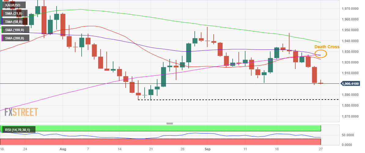 Gold price tested the $1,900 threshold after extending the sell-off into the second day on Tuesday. Gold price had faced rejection again at the critical support-turned-resistance of the 21- and 200-Daily Moving Averages (DMA) intersection, then at $1,926.