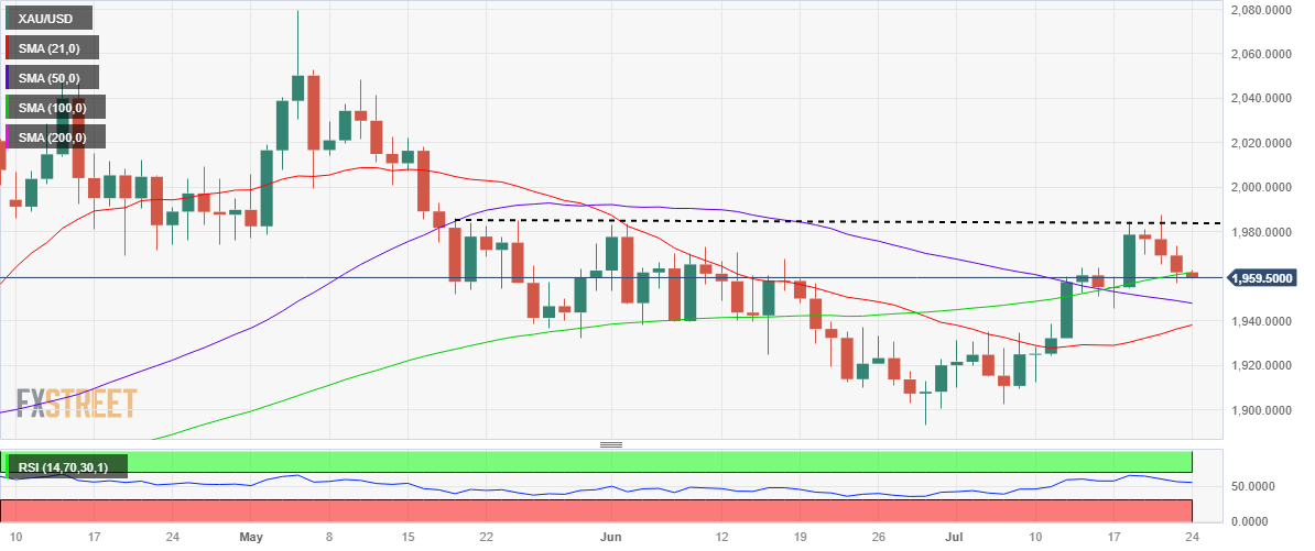 Starting an action-packed week of earnings and central bank meetings, Gold price is treading water as traders refrain from placing fresh directional bets on the bright metal. On one side, expectations that the Fed and the European Central Bank (ECB) are likely to call an end of the tightening cycle could keep the sentiment around the non-yielding Gold price lifted. That leaves room for a hawkish surprise from the Fed and the ECB, leaving Gold buyers on edge.