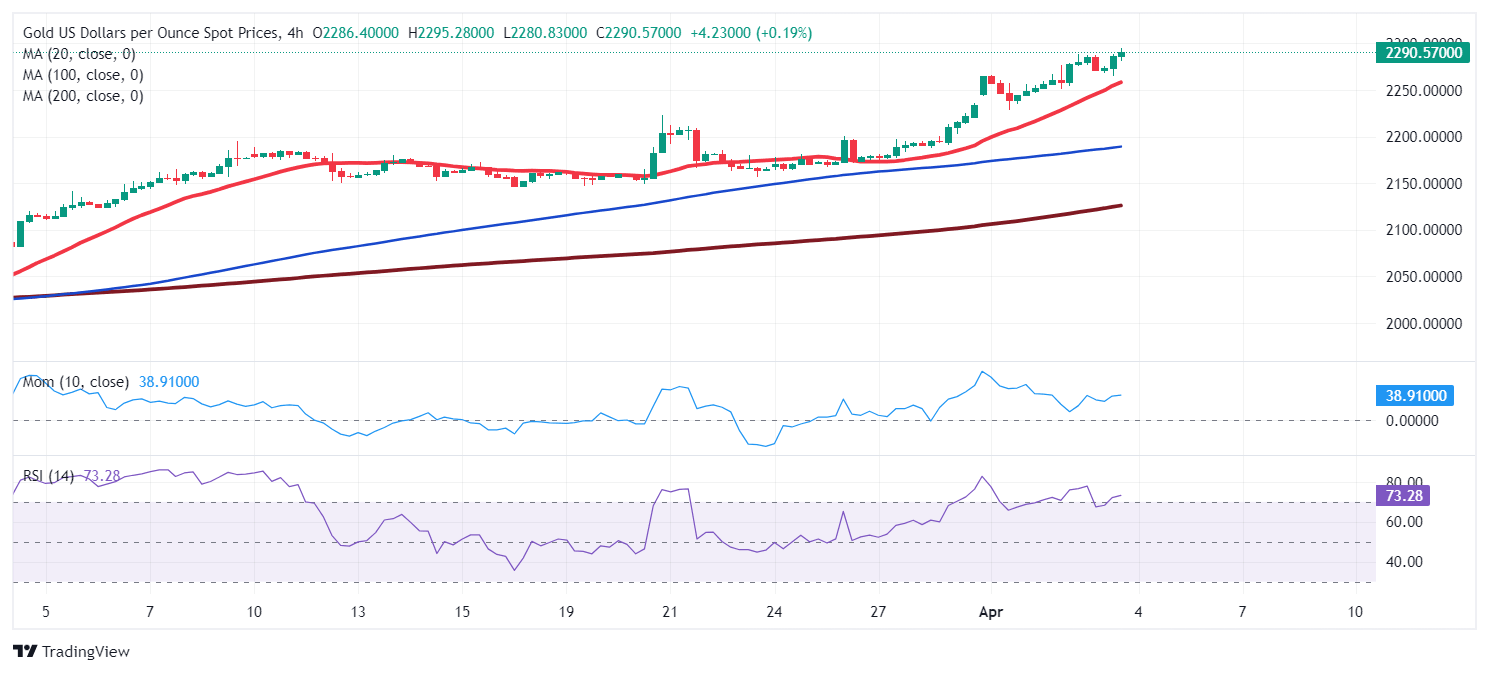Gold's unstoppable rally continues on Wednesday, with the bright metal reaching a fresh record high just ahead of $2,300 a troy ounce. The US Dollar came under strong selling pressure following the release of the United States (US) ISM Services Purchasing Managers Index (PMI), which showed economic activity in the sector expanded in March for the 15th consecutive month, although at a slower-than-anticipated pace. The index printed 51.4, declining from 52.6 in February. The official report attributes the decrease in the rate of growth to "slower new orders growth, faster supplier deliveries and a contraction in employment."