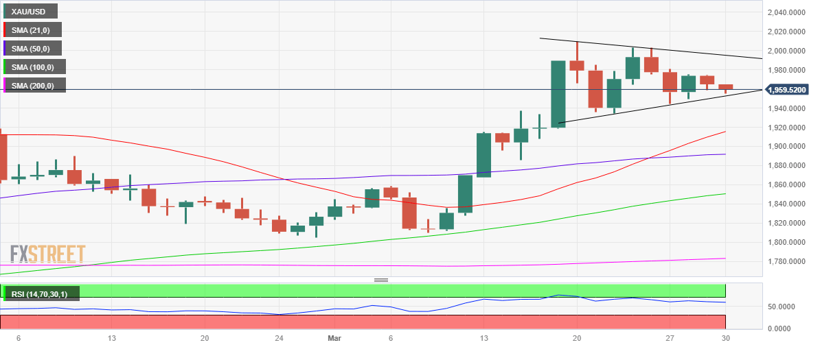 Gold price action could also remain at the mercy of the month-end, as well as, the fiscal year-end flows, which will heavily affect the US Dollar valuations. Friday’s Fed’s preferred inflation gauge, the Core Personal Consumption Expenditures - Price Index, will steal the limelight. The measure is expected to hold steady at 4.7% YoY in February, although any upside surprise could cement a 25 bps Fed rate hike next month. Gold price could extend its correction in the aftermath.